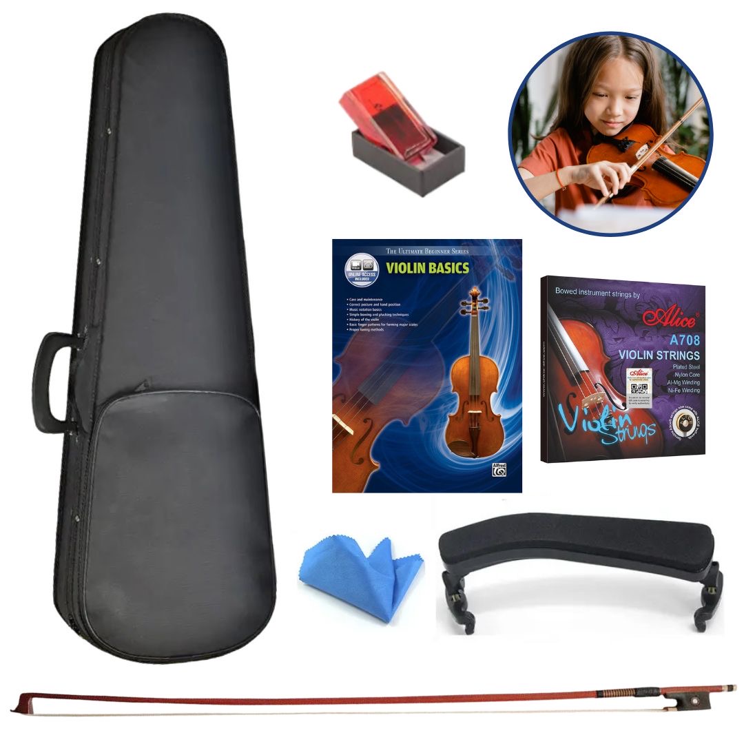 - The package contains one wood bow x1, rosin x1, tuner x1, bridge x1, extra strings x1 pack (includes 4 strings), straps x1, shoulder rest x1, lesson book basics x1 and hard case x1. Professionally set up and ready to play.