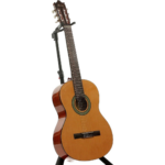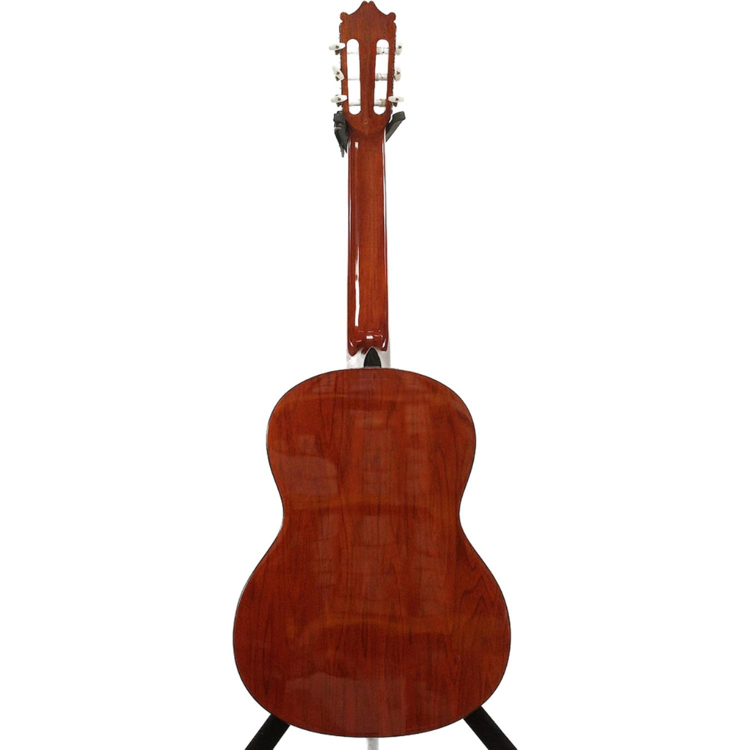 The GA3 features a classical body shape with a laminated spruce top on agathis back and sides with a gloss finish. The soundhole is round with a classical mosaic water slide decal. It has a mahogany neck with a 19-fret rosewood fingerboard. Components include an ivory plastic saddle in a rosewood bridge, a plastic nut, chrome classical tuning machines with pearl buttons and nylon strings.